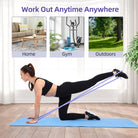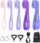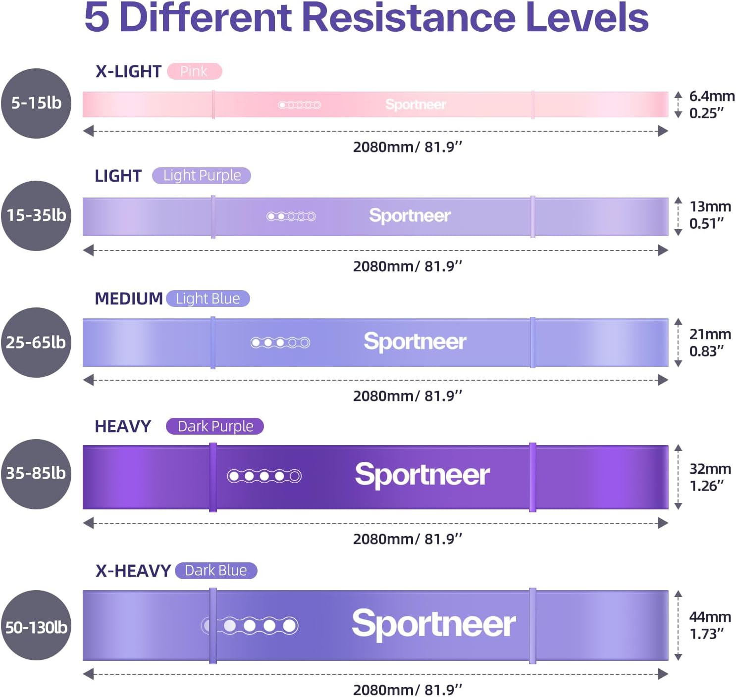 - 5 Resistance Levels (5-130lbs): Pink (5-15), Light Purple (15-35), Light Blue (25-65), Dark Purple (35-86), Dark Blue (50-130).